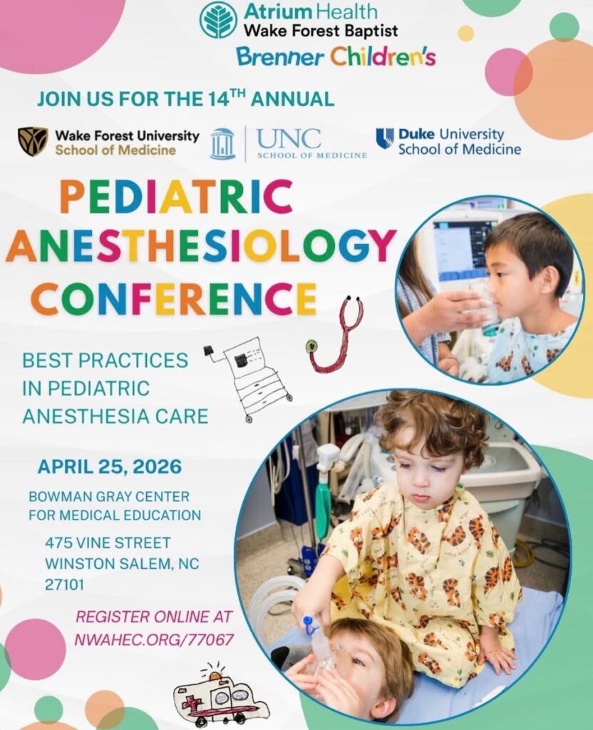 Join fellow pediatric anesthesia care professionals at the 2026 Pediatric Anesthesiology Conference! Hosted by collaborating leaders in pediatric anesthesiology at UNC, Wake Forest University and Duke University, this CME event shares with participants the latest in evidenced-based Best Practices in Anesthesia Care.