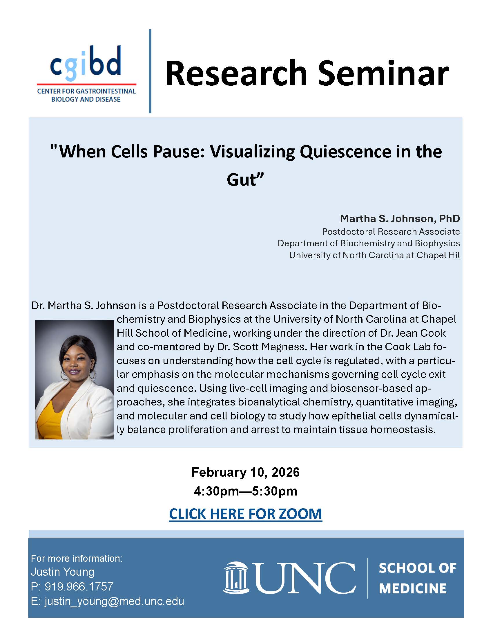 “When Cells Pause: Visualizing Quiescence in the Gut” With Martha S. Johnson, PhD Feb 10 “When Cells Pause: Visualizing Quiescence in the Gut” With Martha S. Johnson, PhD 4:30 pm - 5:30 pm