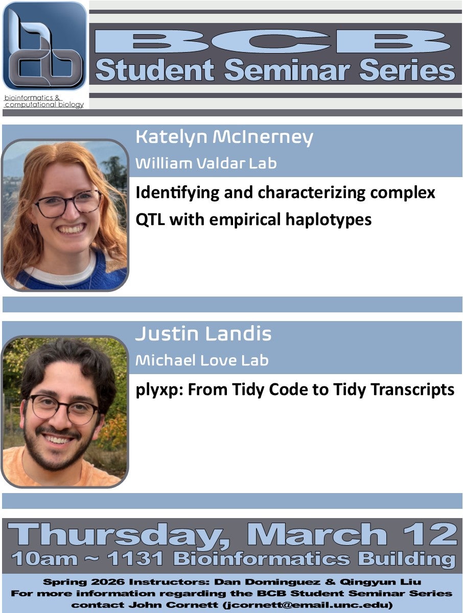 Mar 12 Thursday – BCB Student Seminar Series: McInerney & Landis 10:00 am - 11:00 am 1131 Bioinformatics Building 125 Mason Farm Road, Chapel Hill Event Details Get Directions