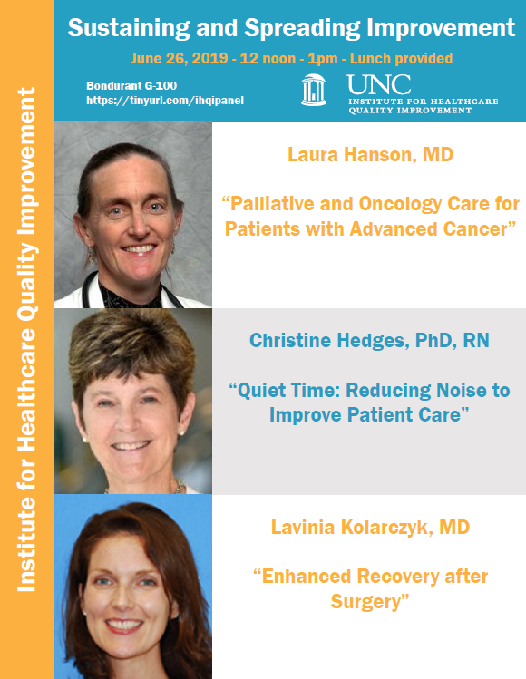 Three of IHQI’s former Improvement Scholars will provide insights on sustaining and spreading improvement at UNC Medical Center on June 26th at 12 noon in Bondurant G-100. Take a look at where their improvement initiatives started by viewing their presentations below, and come to the event to hear about their successes and challenges with sustainment and spread. Lunch provided with registration.