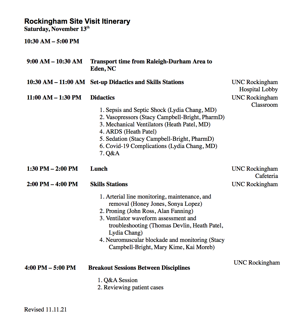 Lydia Chang, MD, associate professor in pulmonary and critical care medicine, and Heath Patel, MD, a third-year fellow, traveled to UNC Rockingham on Saturday, Nov 11, with a team of critical care providers, nurses, pharmacists, and respiratory therapists. The team met with the UNCR Emergency Department and ICU/Medical team to provide education on tools to use when caring for critically ill COVID and other critically ill patients. Steven Eblin, UNC Rockingham Health Care President and CEO, called the team “Medical Center Rock Stars.”