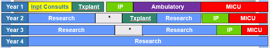 Clinical training during the first year of fellowship is divided among rotations in: Ambulatory Pulmonary, Inpatient Pulmonary Consults, Pulmonary Transplant, Interventional Pulmonary and the Medical Intensive Care Unit. During years two and three, fellows rotate through the MICU, complete their non-MIC critical care electives and spend more time on the Interventional Pulmonary Service advancing their procedure skills. Additional electives can be arranged on an individual basis based upon fellow interests.