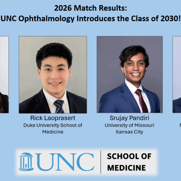 The UNC Department of Ophthalmology began training residents in ophthalmology in 1956. We offer our resident physicians, fellows, and medical students a robust learning experience via current, comprehensive didactic and hands-on teaching. Our goal is to produce leaders in the field of ophthalmology who are medically, surgically, and culturally competent. The Department trains four residents per class, offering them rigorous, hands-on medical and surgical involvement in high-volume comprehensive and complex patient cases toward achieving medical and surgical competence in ophthalmology.