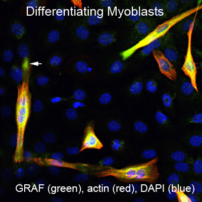 Unlike heart, mammalian skeletal muscle is highly plastic and has the capacity to regenerate after injury. In spite of this fact, muscle wasting does occur and is particularly debilitating in the elderly, in cancer patients, and in patients with congenital muscular dystrophies. While enhancing muscle mass will undoubtedly have a positive impact on morbitity and mortality associated with these diseases, current therapeutic approaches need improvement. We identified a protein termed GRAF (a GTPase activating protein for Rho) a FAK binding partner and component of adhesive complexes that is particularly abundant in developing mammalian skeletal muscle undergoing fusion to form multinucleated muscle fibers. Depletion of GRAF in developing Xenopus laevis tadpoles induced a highly-penetrable dystrophic phenotype that included a pronounced swimming defect accompanied by marked degeneration of muscle fibers, while ectopic expression of Graf in cultured mouse myoblasts induced remarkable muscle cell fusion. Collectively, these studies highlight the exciting possibility that targeting GRAF expression to failing muscle fibers may enhance muscle development and restore muscle function in a multitude of muscle wasting disorders. We now seek to identify the mechanisms underlying GRAF-dependent myotube formation, to test the efficacy of GRAF to counter muscle wasting, and to evaluate whether mis-regulation of GRAF contributes to the pathogenesis of congenital muscular dystrophies.