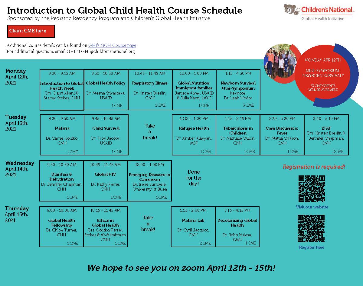 Sponsored by the Children’s National Hospital (CNH) Pediatric Residency Program and Global Health Initiative (GHI), this course is intended for CNH pediatric residents but is also open to all residents, fellows, faculty, nurses, staff, and students outside of Children’s National Hospital. This course offers 18+ lectures throughout the week organized around issues central to global health topics and principles. An exciting and dynamic line-up of presentations and speakers from Children’s National Hospital Global Health Initiative (GHICN) leadership, and other local and global entities such as USAID, Save the Children, Doctors without Borders, George Washington University, University of Buea and more will come together for this spring course.