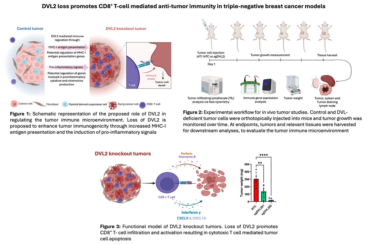 Figure 1: Schematic representation of the proposed role of DVL2 in regulating the tumor immune microenvironment. Loss of DVL2 is proposed to enhance tumor immunogenicity through increased MHC-I antigen presentation and the induction of pro-inflammatory signals. Figure 2: Experimental workflow for in vivo tumor studies. Control and DVL- deficient tumor cells were orthotopically injected into mice and tumor growth was monitored over time. At endpoints, tumors and relevant tissues were harvested for downstream analyses, to evaluate the tumor immune microenvironment. Figure 3: Functional model of DVL2 knockout tumors. Loss of DVL2 promotes CD8⁺ T- cell infiltration and activation resulting in cytotoxic T cell mediated tumor cell apoptosis.