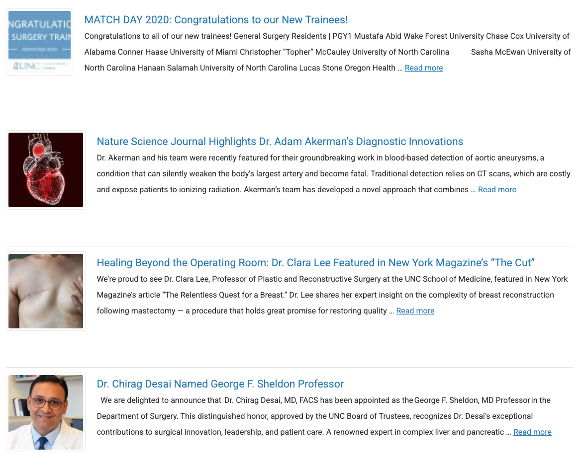 The SOM theme includes shortcode for displaying news posts. There are 3 options that display published posts in different layouts.