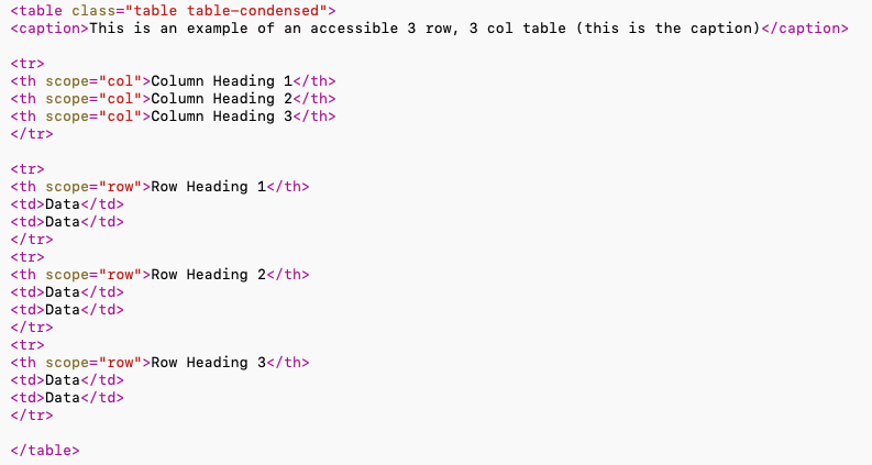- The <thead> should only contain column headers (<th scope=”col”>).